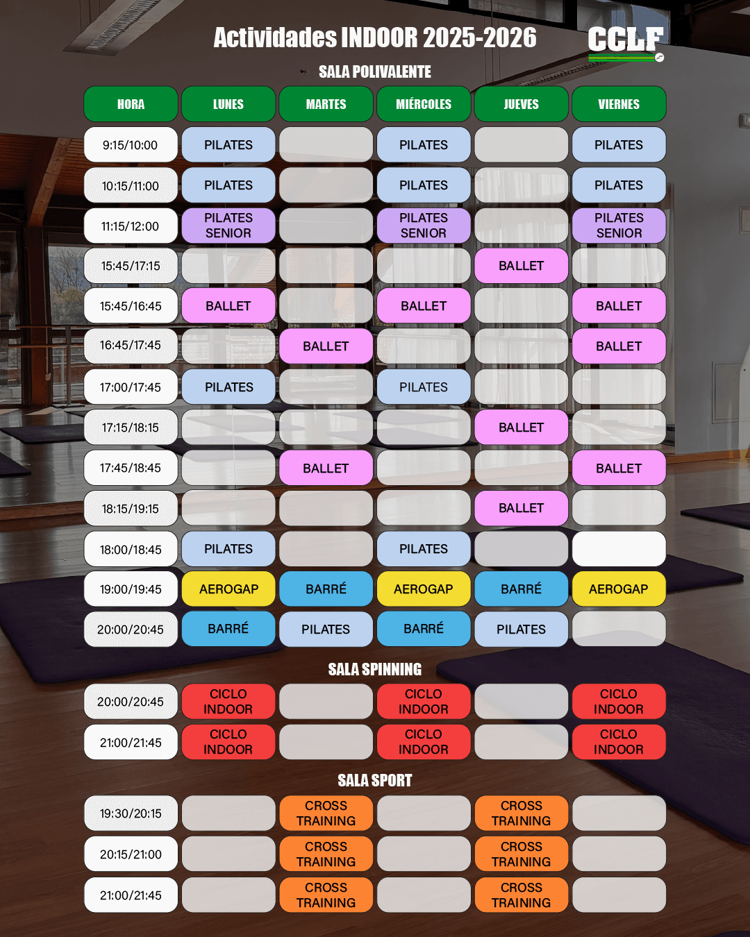 Con el objetivo de seguir promoviendo un estilo de vida activo y saludable entre todos nuestros socios, Actualizamos el horario de actividades indoor, diseñado para adaptarse a diferentes niveles, intereses y disponibilidades horarias. Esta propuesta refuerza nuestro compromiso con el bienestar, la mejora física y el disfrute del deporte en un entorno cómodo y controlado.